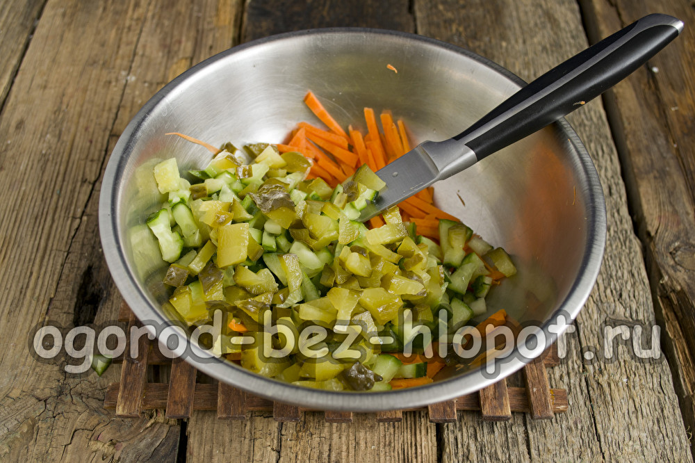 Snijd vervolgens fijn gezouten of ingemaakte komkommer en voeg deze toe aan de kom.