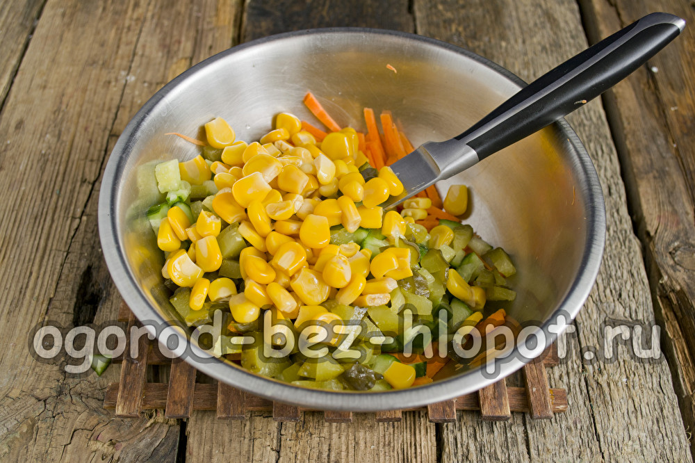 Voeg zout en mayonaise naar smaak toe, breng op smaak met versgemalen zwarte peper, meng grondig en je kunt een snack op tafel serveren.