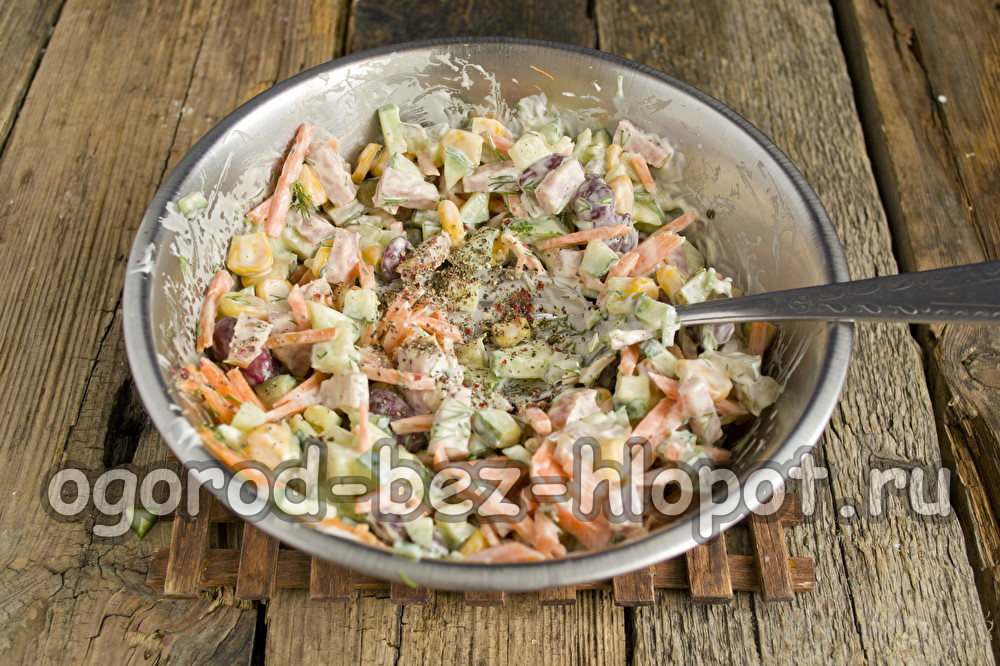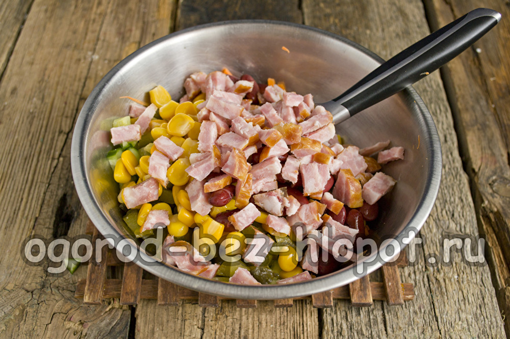 De ingrediënten zijn eenvoudig en betaalbaar - sommige rookworsten, verse en ingeblikte groenten en mayonaise voor dressing. De samenstelling van deze salade kan worden gewijzigd, afhankelijk van de producten die in de winkel zijn gekocht of in de koelkast zijn gevonden. Vervang bijvoorbeeld gerookte worst door gekookte, bonen met groene erwten, augurken of voeg geraspte kaas toe. Het blijkt in elk geval heerlijk, snel en gemakkelijk!