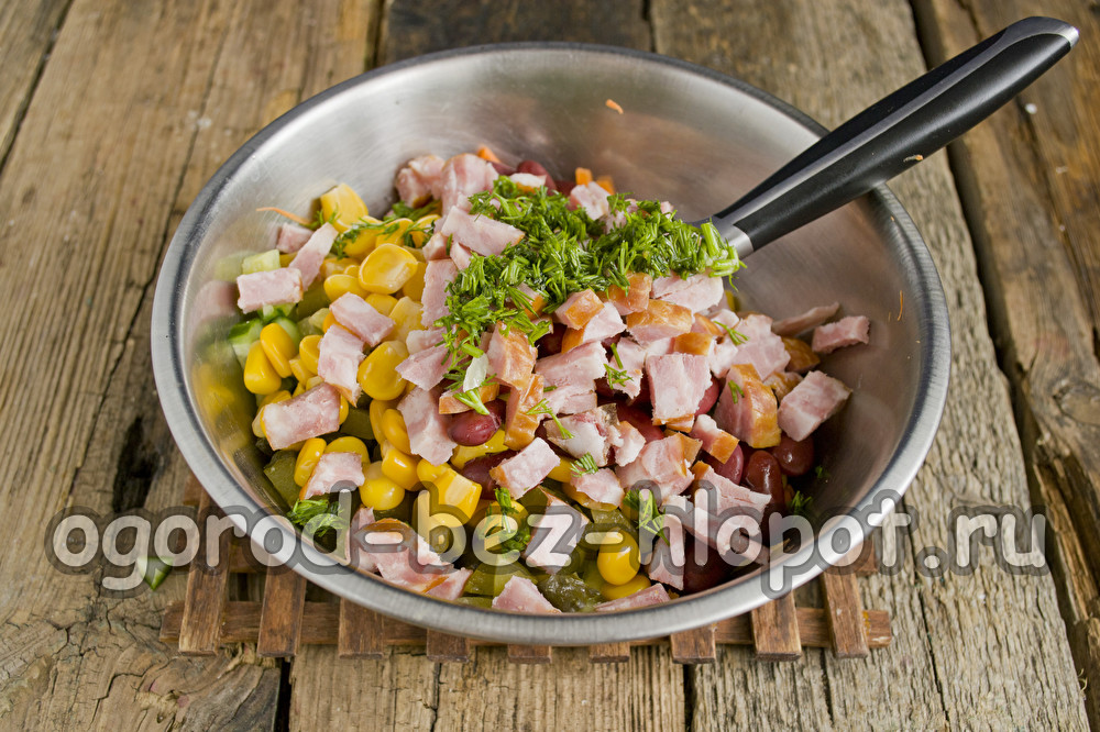 Doe nu de rode bonen in blik in de kom. Deze salade kan ook worden gekookt met groene erwten of witte bonen.