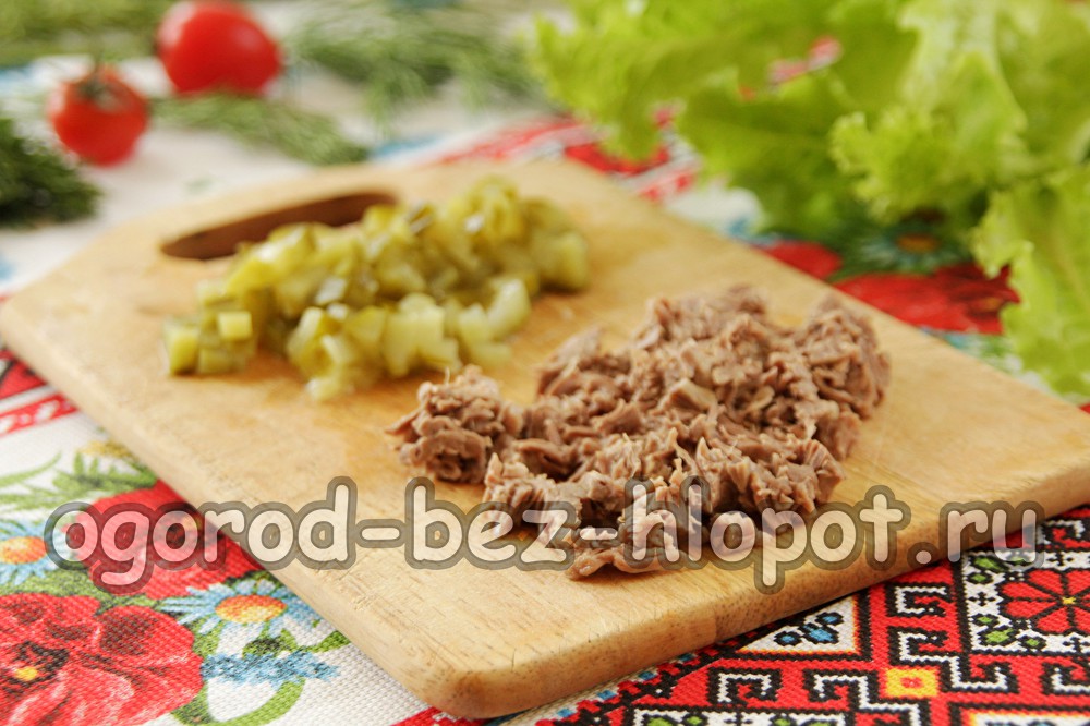 Eerst bereiden we alle ingrediënten voor. We snijden het gekookte rundvlees in kleine blokjes - elk ongeveer 0,5 cm. Ingemaakte komkommers snijden ook in kleine blokjes.