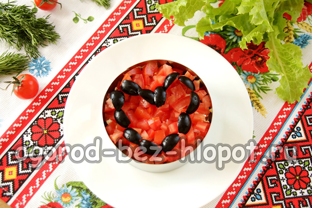 Verspreid een laag tomaten. Stukjes tomaat moeten het hele oppervlak van de salade bedekken, d.w.z. de bovenkant van de salade moet volledig rood zijn.