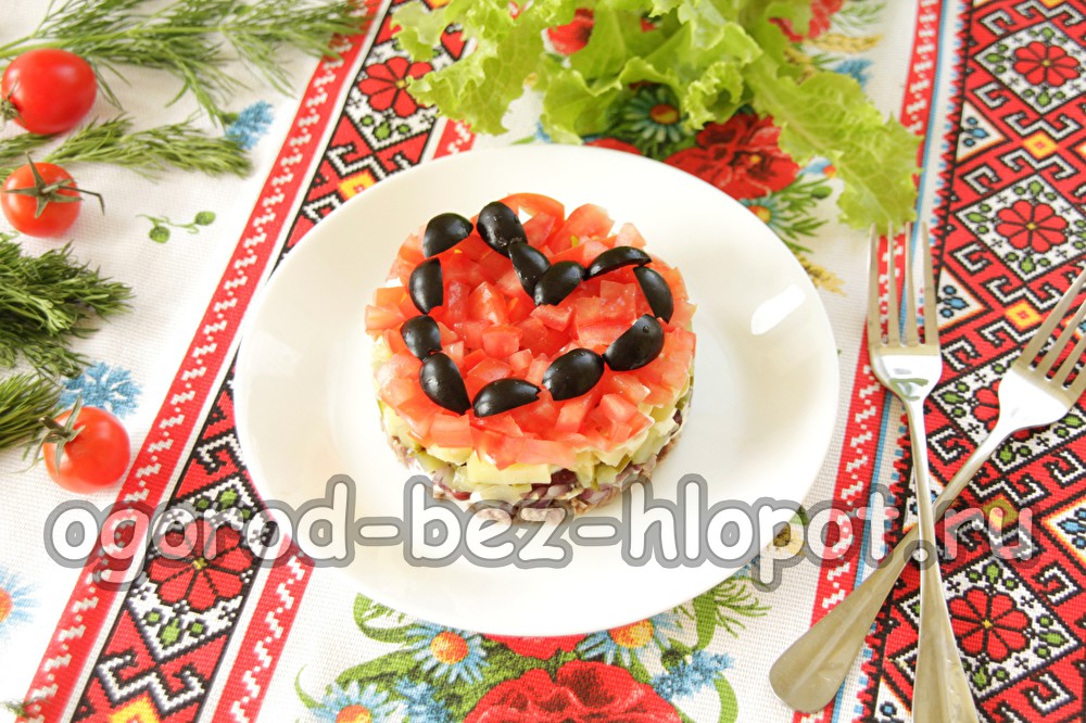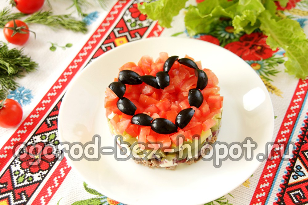 Het wordt bereid volgens dit stapsgewijze recept met een foto met gekookt rundvlees, uien, bonen en ingelegde komkommer. En het hoogtepunt van deze salade is een ongewone decoratie: het is een hart van zwarte olijven op een rode achtergrond van tomaat. De salade dankt zijn ontwerp eigenlijk aan zijn naam.