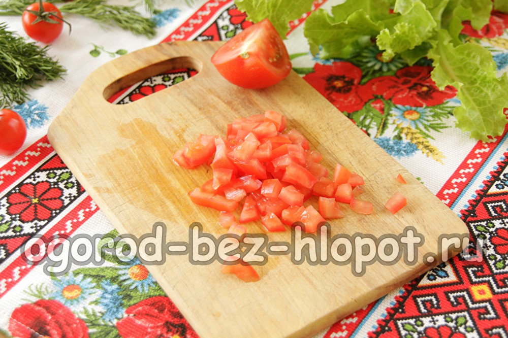 Snijd de tomaat in dezelfde kleine blokjes als de rest van de ingrediënten. Maar we gebruiken alleen het dichte deel en verwijderen de pulp met zaden.