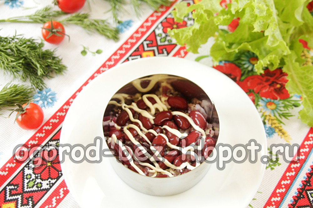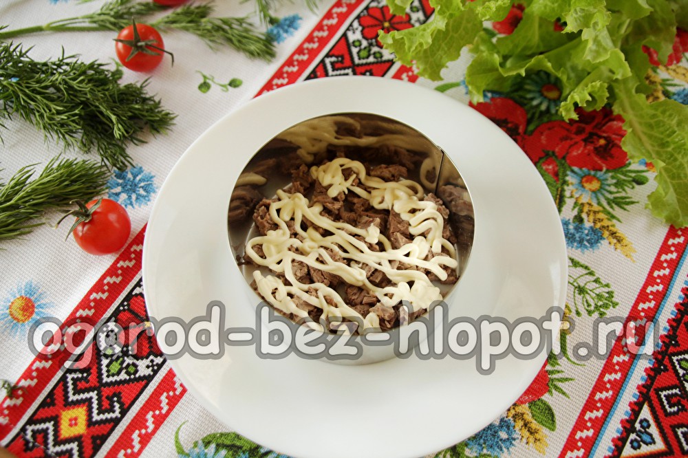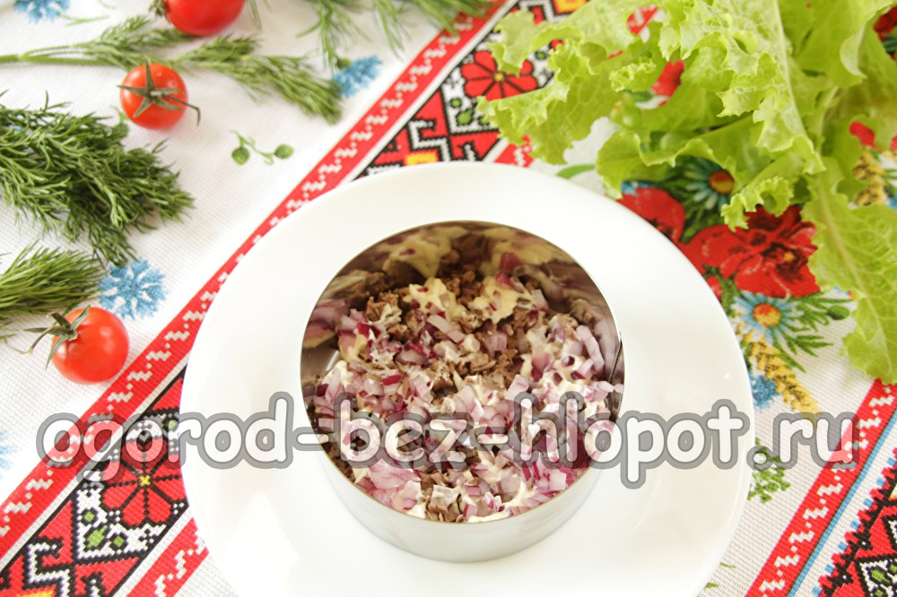 We vormen de salade met behulp van de culinaire ring, leggen de salade in lagen.