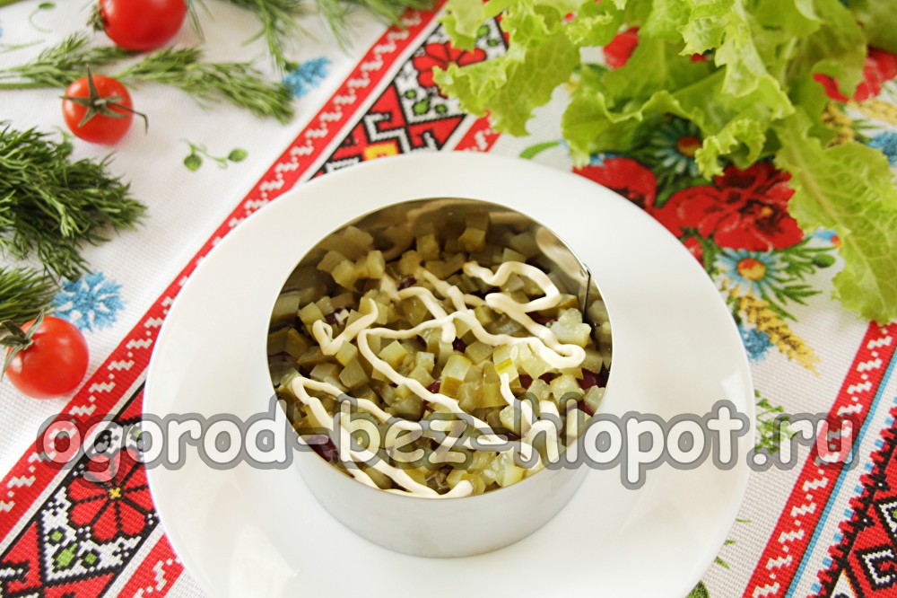 Dan zetten we ingelegde komkommers, vet met mayonaise.