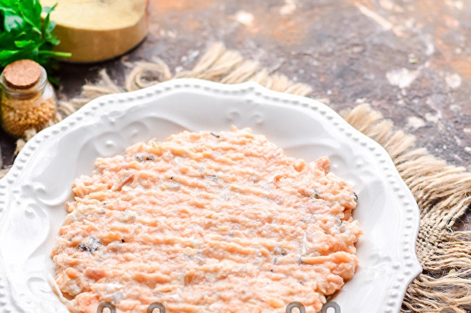 Producten op een lijst voorbereiden. Open een pot roze zalm, laat het sap weglopen, leg de vis op een bord, kneed met een vork. Verplaats vervolgens de vis naar een gerecht dat we voor het serveren bereiden.