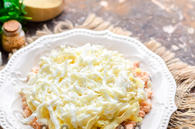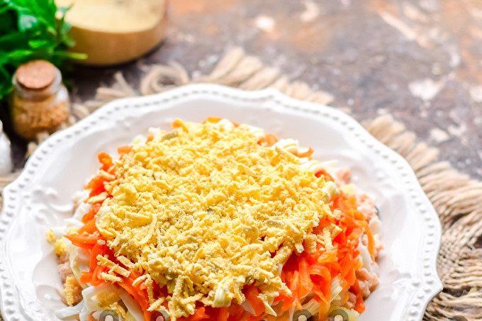 Hardgekookte kippeneieren, geschild en verdeeld in eiwitten en dooiers. Rasp de eiwitten op een middelgrote rasp en doe in de salade met de volgende laag.