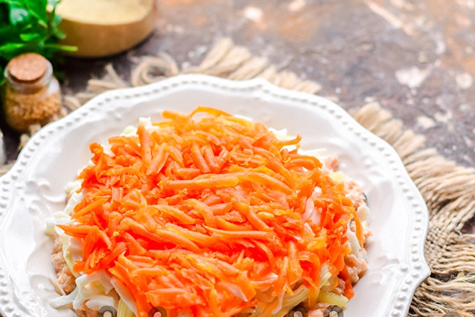 Kook wortelen van tevoren, schil en rasp. Leg de wortels in de volgende laag.