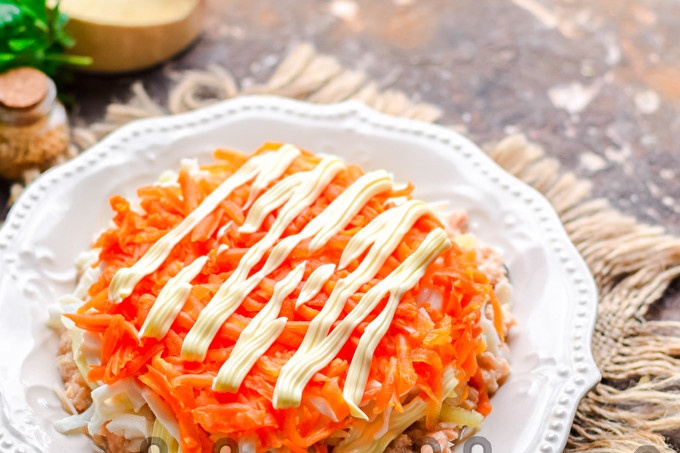 Salade bereid in een dergelijke interpretatie zal zeker geschikt zijn voor een feestelijk feest, gasten zullen uw inspanningen met waardigheid zeker waarderen. Het bereiden van het gerecht is eenvoudig. Dit omvat de traditionele set ingrediënten die voor de klassieke versie geldt: wortelen, uien, ingeblikt voedsel, eieren, een paar aardappelen. Het is beter om hier geen boter toe te voegen.