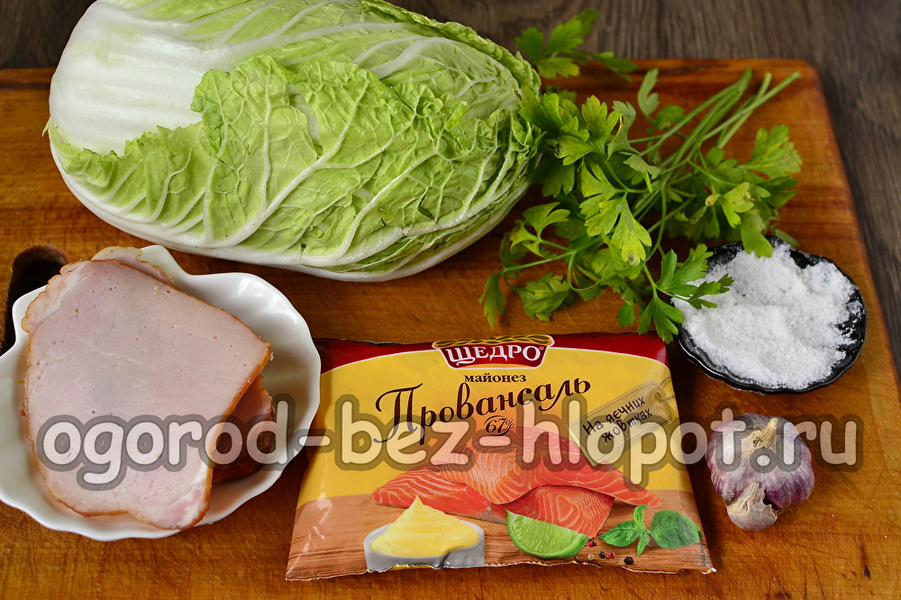 Deze salade komt onvergelijkbaar delicaat en smakelijk uit, alle componenten zijn perfect met elkaar gecombineerd. Knapperige Peking-kool "maakt perfect" met gerookte ham, en dit blazen past perfect bij de kruidige knoflook en geurige peterselie. Mayonaisesaus maakt het plaatje compleet.