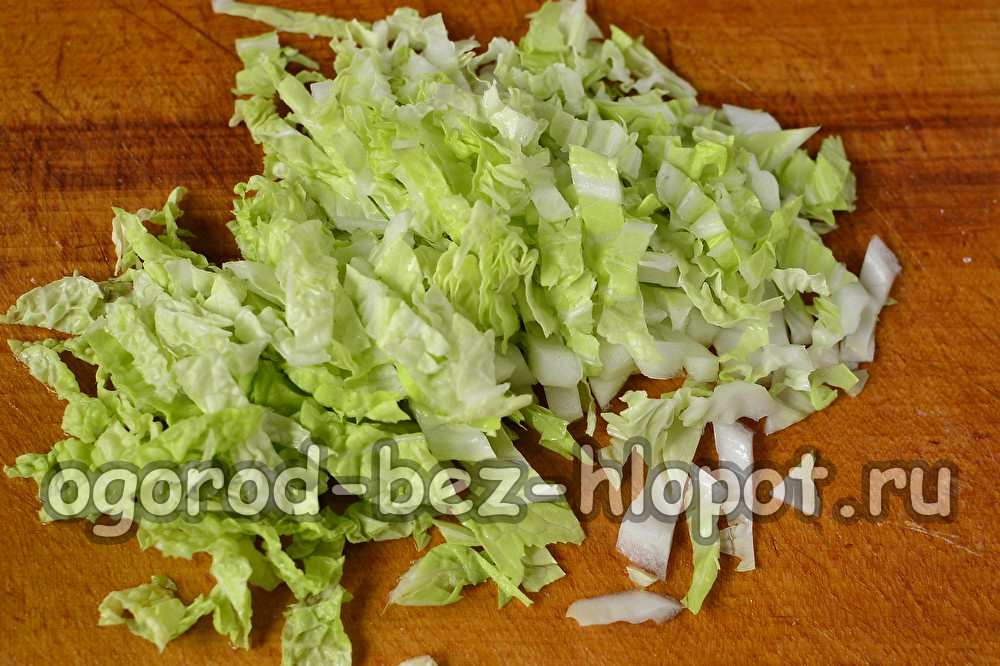Het is beter om Beijing-kool te nemen, maar kan worden bereid uit witte kool. Je kunt ook de paarse kop nemen en dan zal onze salade schitteren met nieuwe kleuren. Hak de kool fijn.