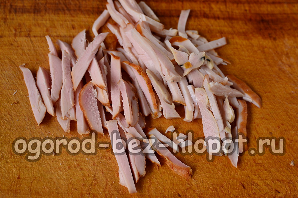 We verwijderen de knoflook van de schil, wassen en verzenden onder de pers, of drie op een fijne rasp. Voeg ham en knoflook toe aan Beijing. We hakken het groen van de haan met een mes en gooien het naar de resterende componenten. Daarna vullen we alles met mayonaise en mixen.