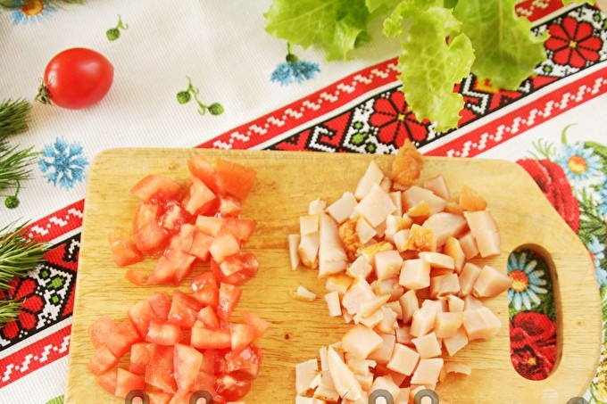 In deze salade kunt u zowel gekookte kip (een meer dieetoptie) als gerookt gebruiken, zoals in dit stapsgewijze recept met een foto - de smaak zal meer verzadigd zijn, maar dit is een minder dieetoptie.