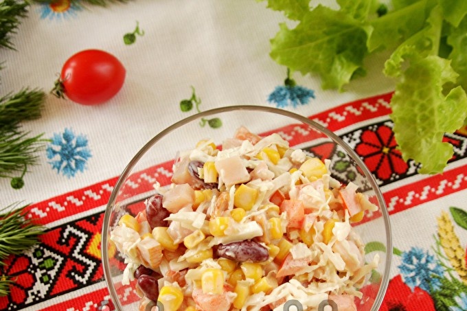 Salade met kip, bonen, maïs en groenten is niet alleen helder, watertanden, maar ook stevig, smakelijk. Het wordt snel en gemakkelijk bereid en is in de regel door absoluut iedereen geliefd.