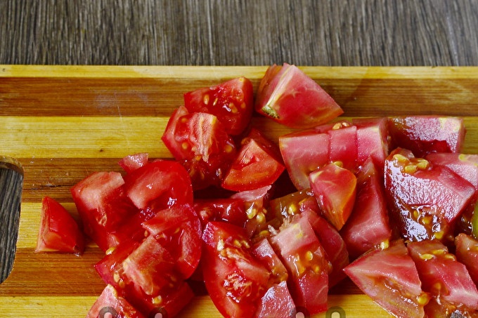 Dit keer behandelen we de rest van de groenten: we snijden de tomaten in plakjes.