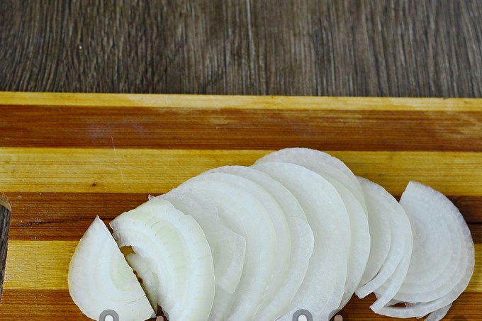 Snijd de gepelde uien in halve ringen.