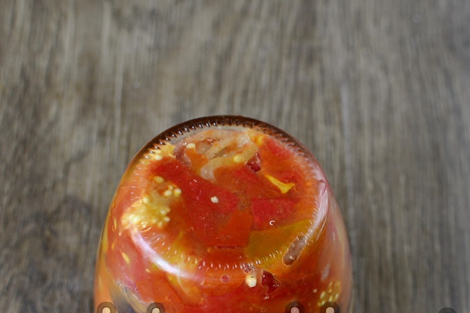 Vul steriele potten tot de bovenkant met trojaansalade en sluit af met steriele deksels.