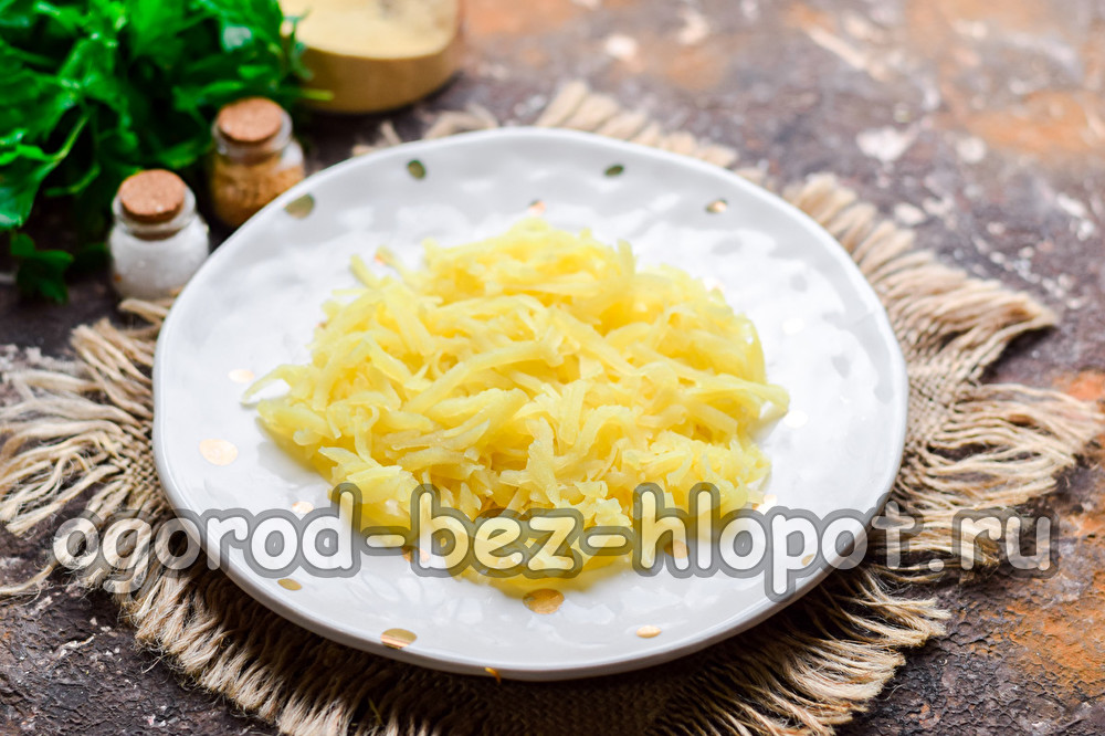 Schil en rasp gekookte aardappelen. Bereid een bord voor salade - leg de chips in de eerste laag.