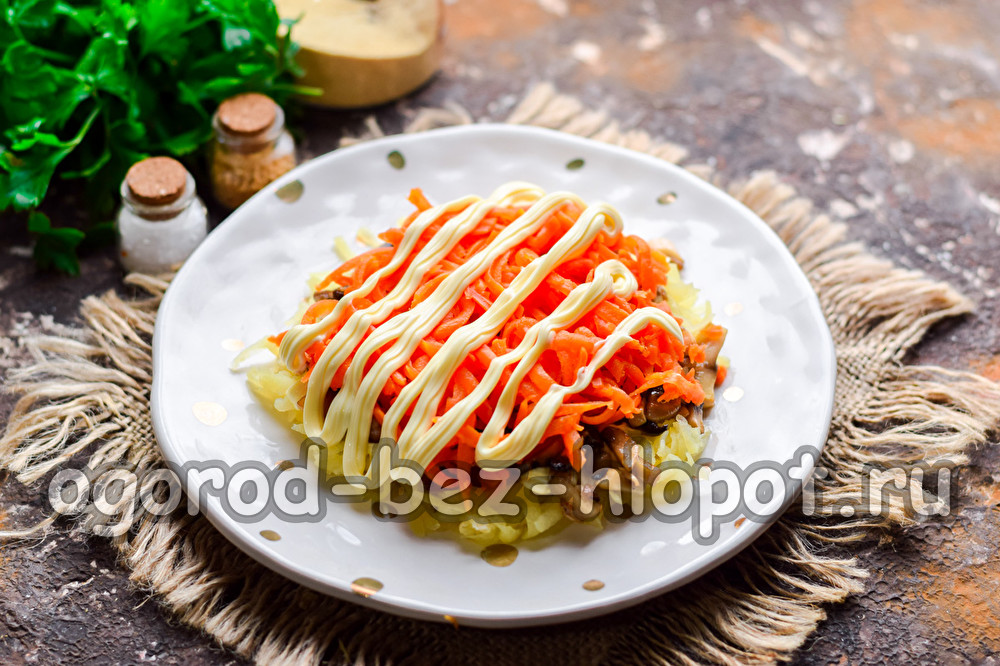 Schil gekookte wortels en rasp op een middelgrote rasp. Plaats wortelschilfers bovenop de champignonlaag. Vet een laag wortels in met mayonaise, zout.