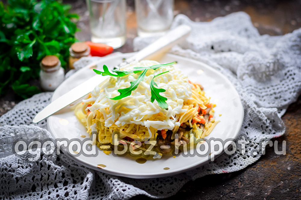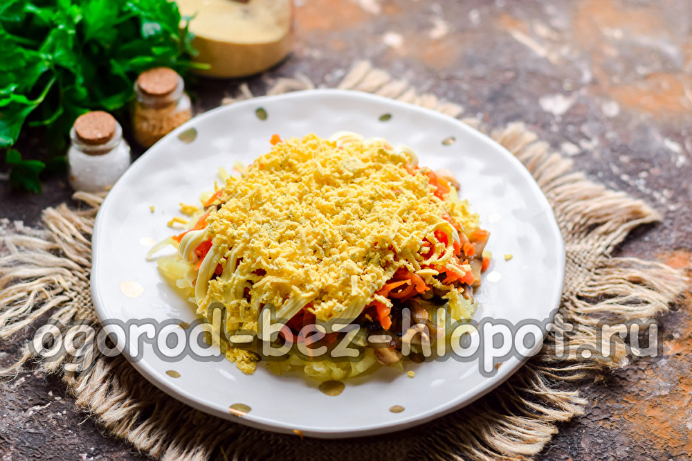 We zullen paddestoelen in het hart van de salade hebben: hier kun je er alle gebruiken die beschikbaar zijn - champignons, oesterzwammen, bospaddestoelen. Het zijn paddenstoelen die de salade een smaak zullen geven. Voeg ook aardappelen, gekookte wortelen, kaas en kippeneieren toe. Alle ingrediënten combineren perfect naar smaak met elkaar, ze maken ons gerecht ongelooflijk lekker en voedzaam.