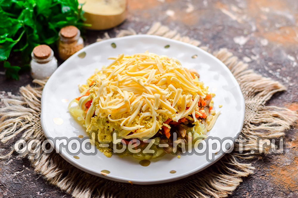 Leg op de kaas eiwitten, geraspt op een middelgrote rasp. Laat de salade een uur weken en serveer.