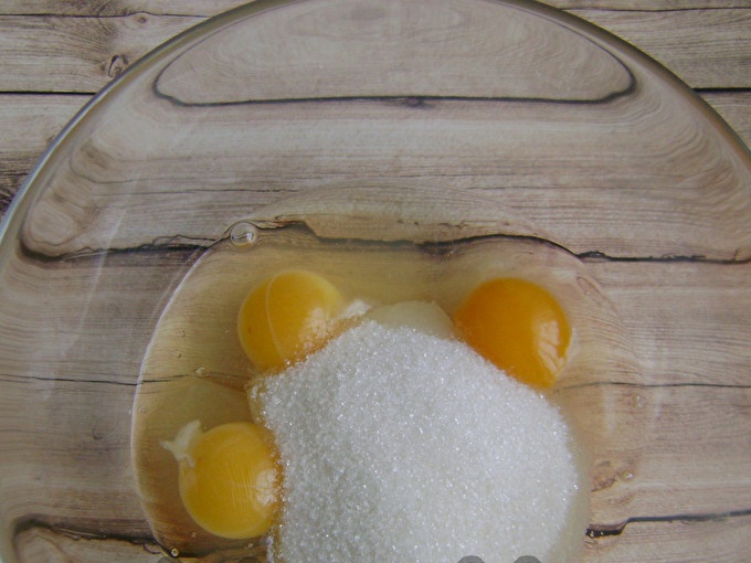 En versla ze tot weelderig. Het volume eieren met suiker moet 2 keer toenemen.