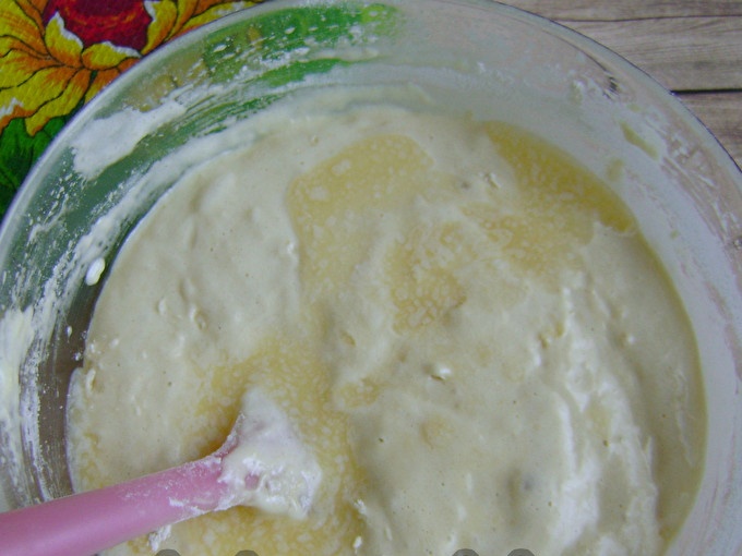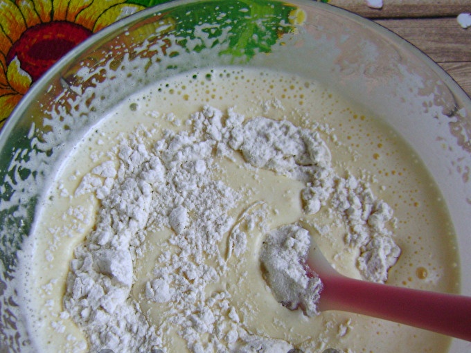 We brengen de gezeefde bloem in de eimassa en mengen het deeg heel voorzichtig met vouwbewegingen.