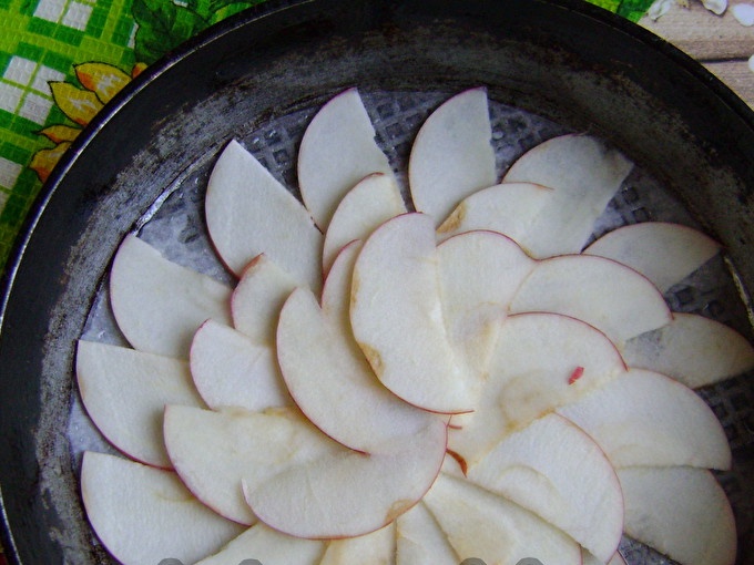We leggen bakpapier op de bodem van de pan. Smeer het met plantaardige olie en leg dun gesneden appelschijfjes neer.
