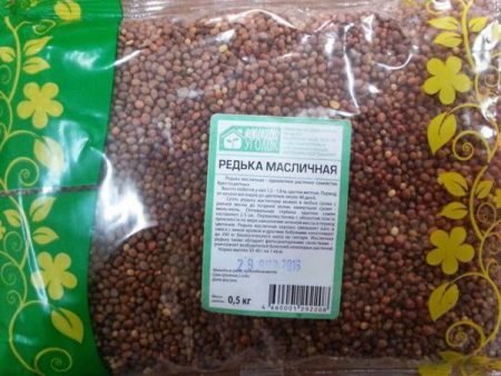 De plant behoort tot de koolfamilie, heeft lange stengels tot 1,5 meter, die sterk vertakt zijn. De bloemen zijn wit - lila. Het groene deel van de radijs groeit snel, in twee maanden neemt het meerdere keren toe. Deze plant is in staat om onkruid te verdrinken, om de vruchtbare bodemlaag te reinigen van schadelijke micro-organismen. Pannenkoekenweek radijs wordt gezaaid van begin april tot september. 200-300 gr zijn genoeg voor honderd delen. zaden.
