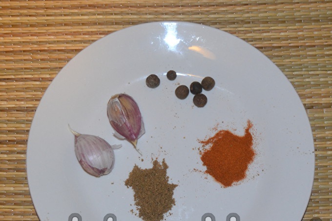 We persen de knoflook, voegen deze toe aan de gehakte kruiden. Hieraan voegen we hop-suneli en gemalen peper toe. Hak een plak hete peper fijn. De scherpte van pruimensaus voor vlees doet geen pijn. Als er geen verse hete peper is, kan deze worden vervangen door gemalen hete rode peper. Hete pepers worden naar smaak toegevoegd. Meng alle voorbereide kruiden, maal ze samen in een vijzel.