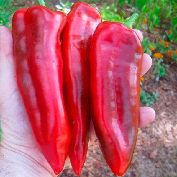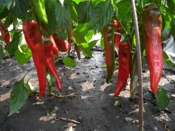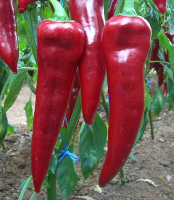 Krachtige planten van deze soort worden gekenmerkt door gemiddelde verspreiding. De struiken bereiken een hoogte van 90 cm en zijn elk versierd met langwerpige kegelvormige vruchten met een rode glanzende glans. Onrijpe paprika's blijven groen totdat een periode van biologische volwassenheid komt, die wordt gekenmerkt door een mooie donkere schaduw. De gemiddelde lengte is zelden meer dan 22 cm, de vruchten zijn gemiddeld in gewicht, elk 150 g.