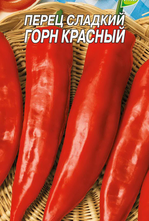 Struiken peper verspreiden zich, ongeveer een meter hoog, langwerpige peperkorrels van een cilindrische vorm, bedekt met een scherpe "neus" op de punt. Een langwerpige vrucht weegt 110-120 g. Een karakteristieke rijke rode kleur spreekt van biologische volwassenheid. De vruchten zijn sappig, dicht, met een ongelooflijk aangename geur. Een aantrekkelijk kenmerk van de Hoorn blijft weerstand tegen een aantal pathogenen van gevaarlijke culturele ziekten.