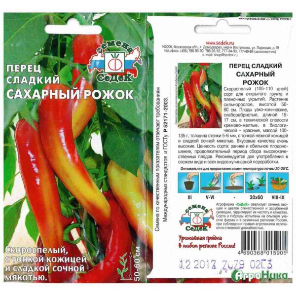 Krachtige struiken blijven krachtig tot de laatste dagen van "hun leven". Maar hun hoogte is zelden meer dan 60 cm, maar dit belet niet dat de plant veel vruchten van 18 cm en een gewicht van 140-150 g vormt. De dichtheid van de muren is gemiddeld, niet meer dan 0,6 cm.De vorm is langwerpig, maar lijkt op een kegel, gecombineerd met ribben, waardoor de vruchten er interessant uitzien. Rode kleur geeft biologische rijpheid aan. Maar daarvoor behouden de paprika's lang een romige schaduw. Het vlezige vlees is verborgen onder een dunne, gladde schil. Waardeer de suikerhoorn voor zijn gulle en langdurige vruchtvorming.