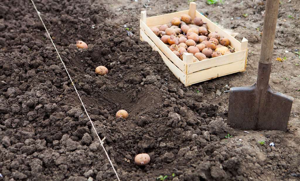 Het is beter om een gewas niet in de schaduw van bomen te planten, maar op een goed verlichte plek. In het ideale geval moet de aarde los en luchtig zijn, zodat de zaden voldoende zuurstof ontvangen. Aardappelen worden gelegd in gaten tot een diepte van 8-10 cm voor 1-3 stks. De afstand tot elkaar is 30 cm en tussen de bedden 50 cm.