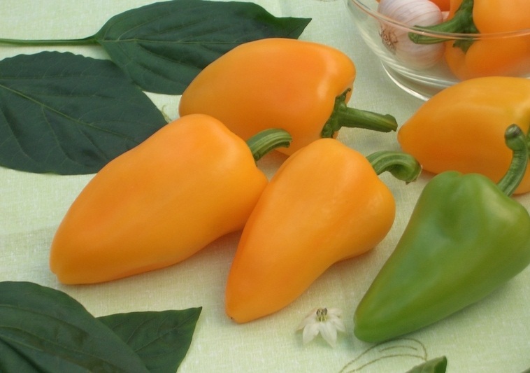 Vruchten worden gevormd grote, regelmatige kubusvormige vorm, verdeeld in vier gezichten. In de groeifase hebben paprika's een lichtgroene kleur en tegen de tijd dat ze volledig rijpen, is de kleur gevuld met felgele en oranje verf. Paprika's zijn vrij zwaar, groot, dik en hebben een massa van 150-200 gram. De pulp is dicht, sappig en erg zoet.
