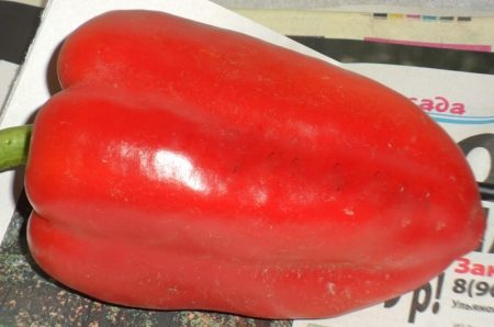 De vruchten van de variëteit zijn groot, massief en wegen tot 160 gram. De schil is niet meer dan 5 millimeter, glanzend, glad, verzadigd rood. De vorm van de resulterende paprika's is vergelijkbaar met afgeknotte kegels of een prisma. Vruchten worden ongelijk gevormd op de struik, groeien hangend. De waarde van het ras ligt in de hoge productiviteit van de struiken: 4,5 kilogram geselecteerde goederen komen uit een vierkante meter.