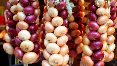 Het is handig om een bol op de groenten te planten en elke twee weken een veer voor voedsel te verzamelen. Druiven en uien leven vreedzaam naast elkaar, conflicteren niet.