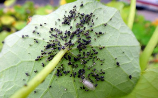 Op komkommers - en in de bedden en in de kas - worden kalebasluizen opgemerkt. Haar groene scheuten van planten worden onderworpen aan haar aanvallen, waaruit ze het sap zuigt. Vluchtloze volwassenen hebben een groen-gele kleur. Gevleugeld - het is zwart of moeras. Minder vaak worden microscopisch ongedierte met een witte, bijna transparante kleur opgemerkt op het groentegewas. Omdat zwarte bladluizen op komkommers in kolonies leven, is het gemakkelijker om ermee om te gaan: naarmate de scheuten bevolken, worden donkere vlekken zichtbaar met het blote oog.