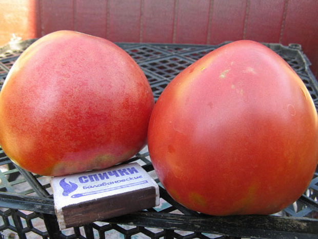 Allereerst zijn de vruchten die hij echt krijgt vrij groot, hoewel niet fel rood of roze. De foto laat zien dat ze een beetje bleek zijn, niet te aantrekkelijk voor de helderheid van hun kleur, evenals een afgeronde vorm. In deze variëteit zijn de vruchten vrij groot, elastisch, vlezig, maar niet helder genoeg. Met hun langwerpige vorm lijken ze op een hart of mango, vooral als de kleur niet zo uitgesproken dichter bij de rand van de stengel is. De afmetingen van de vruchten zijn echt vrij groot, maar er zijn geen beoordelingen op internet waar een tomaat ongeveer 700 gram of meer woog. Kortom, zulke grote vruchten groeien waar sprake is van een hoge luchtvochtigheid en veel neerslag en minerale zouten. Het is beter om het in de tuin te kweken dan in kasomstandigheden.