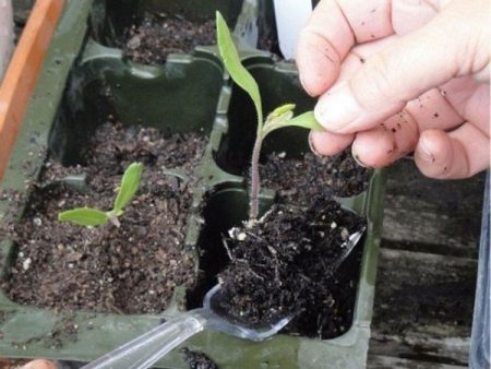 - 2 uur voor de procedure wordt de grond overvloedig bewaterd. Houd de boring vast bij de zaadlobbladeren, graaf deze voorzichtig op en plant deze samen met een brok aarde in een aparte container. Geplukte tomaten worden bewaterd totdat de grond nat wordt.