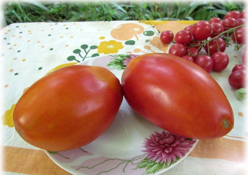 De vruchten zijn zwaar, 200-250 gram. Ovale vorm met verlenging, die doet denken aan het uiterlijk van paprika. De huidskleur is rood; de steel kan een stipje hebben. De pulp is zacht, de afdronk is aangenaam. 2-2,5 kg wordt verzameld uit één struik. fruit.