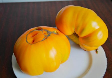Struiken worden krachtig, stengels zijn dik. De plant is onbepaald, je hebt een kousenband nodig om de steun en knijpen. Zorg voor een goede oogst waardoor de plant in 2 stelen kan worden gevormd. De groene massa is sterk ontwikkeld, de bladeren zijn groot, donkergroen. Het is mogelijk om in het zuiden van Rusland op open grond te groeien, en in de middelste en noordelijke strook wordt het aanbevolen om de tomaat onder filmopvangplaatsen te cultiveren. Gemiddeld bereikt de opbrengst 7-8 kilogram per vierkante meter. De vruchten zijn groot, maar niet veel zijn aan de struik gebonden, dus 2-2,5 kg kan van de plant worden verzameld. fruit.