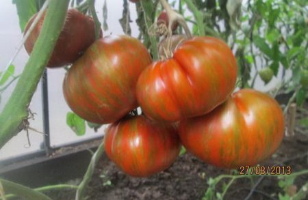 De variëteit is vrij zeldzaam en weinigen groeien. Een paar jaar geleden zag ik bij een buurman in een kas en wilde ook zo'n schoonheid. Ik zorgde voorzichtig - matig water geven, stiefzonen verwijderd, gevormd in 2 stengels. Mijn inspanningen werden beloond met een prachtige oogst. Uiterlijk mooie tomaten tevreden met een suikerachtige smaak en sappigheid.