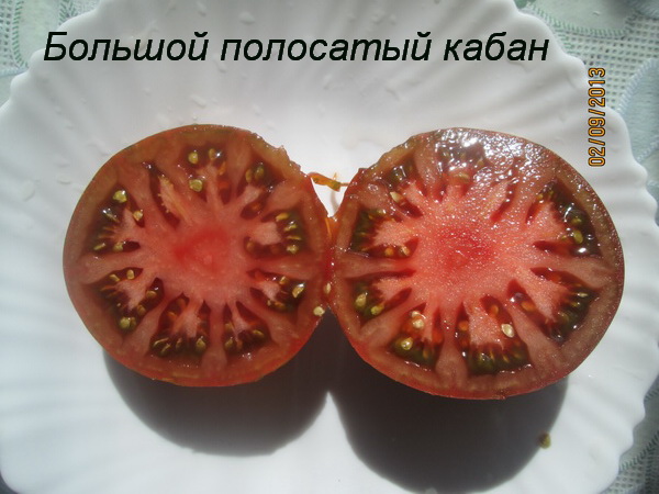 Tomaat "Large Striped Boar" (Large Barred Boar) is ontworpen voor de teelt onder kasomstandigheden in centraal Rusland. De variëteit wordt gekenmerkt door een goede productiviteit, sappig en smakelijk fruit met een exotische tweekleurige kleur.