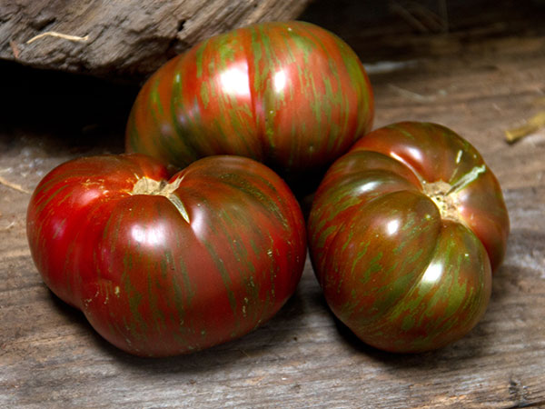 De vruchten van de variëteit "Big Striped Boar" hebben een ronde afgeplatte vorm. Elke tomaat weegt ongeveer 250-400 gr. De kleur is ongebruikelijk, tweekleurig - donkerbruin met groene strepen. Het felrode vruchtvlees is sappig en zoet. Het buitenste deel van de vrucht is bedekt met een dunne stapel die op een perzik lijkt. Om zijn ongewone oppervlak en kleur werd de variëteit de "Big Striped Boar" genoemd.