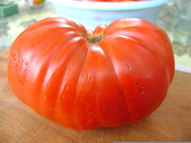 Ze ontving zaden van deze tomaat van een buurman, en ze ontving het via haar vijfde handen van een amateur die verschillende variëteiten verzamelt. Gekweekt in een kas vond ik de variëteit erg leuk - zowel qua smaak als qua grootte. De Braziliaanse reus eist water geven, anders zal hij barsten. Mijn eerste tomaten waren zo, maar toen stelde ik snel het schema op en de volgende borstels waren allemaal mooi, groot. Gewicht - ongeveer 800 gram - twee tomaten, de rest binnen 500-600 gram. De kleur is oranjerood, maar meer rood.