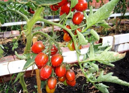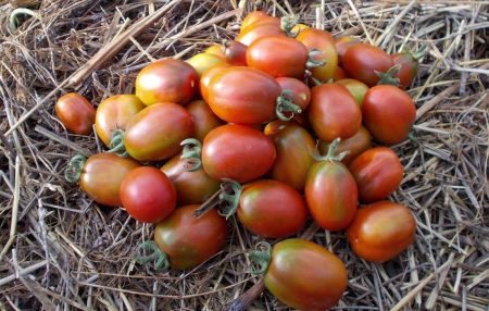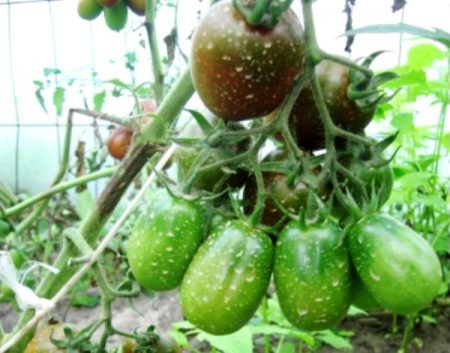 Kleine tomaten met een gewicht van 40-70 gram hebben een afgeronde vorm. In het stadium van technische volwassenheid, groen, wanneer volledig gerijpt, is een donkerpaarse kleur geschilderd. De schil is dun, de pulp is dicht, het smaakt zoet, de tomaten zijn uitgerust met 2-3 kamers. Ze bevatten tot 6% vaste stof. Kortom, dit ras wordt vers gegeten, omdat het een uitstekende smaak heeft en elke salade een feestelijke uitstraling zal geven. Tomaten zijn ook geschikt om te beitsen en te bewaren, sap en pasta kunnen worden bereid, maar zelden gebruikt iemand ze hiervoor.