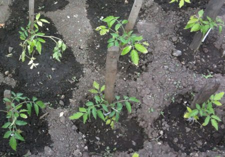 Op een vierkante meter maken de bedden slechts twee gaten. Het is raadzaam om een eetlepel as aan het gat toe te voegen. De spruit in het gat wordt verticaal geplaatst, zonder de wortels te draaien, waarna deze met aarde wordt bestrooid en overvloedig rond de stengel wordt bewaterd.