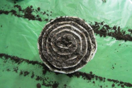 Wanneer de hele "slak" bedekt is met aarde, opgerold en gefixeerd is met een elastische band, moet deze verticaal worden geplaatst en bovenop meer aarde toevoegen zodat deze alle draaien van de rol bedekt.